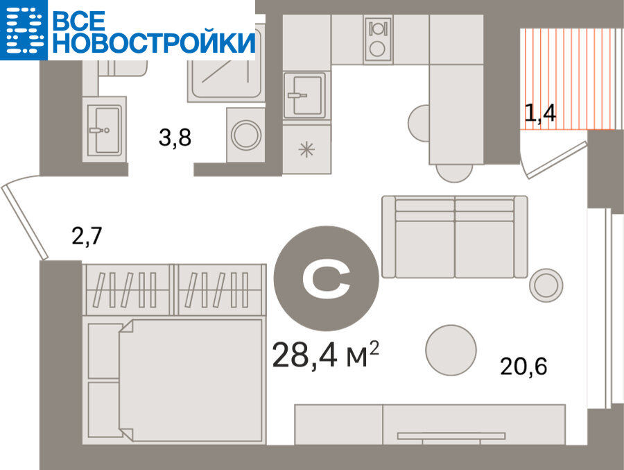 1-комн. квартира-студия с первичной отделкой в ЖК "Северный ветер" на 8 этаже. Общая площадь: 28.44 кв.м., площадь гостиной 20.6 кв.м., из которых 5 кв.м. выделено под кухонную зону. Все окна выходят на одну сторону. В квартире одна лоджия, один совмещенный санузел. Высота потолков 3.1 м.