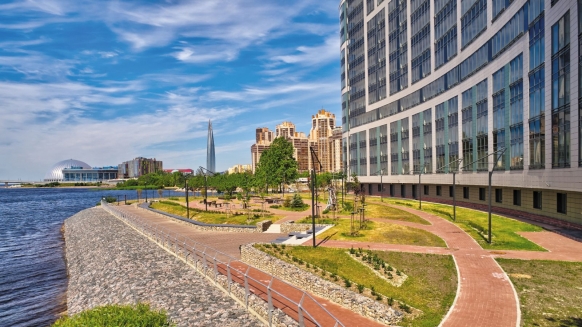 Комплекс расположен в непосредственной близости от воды, и «Группа ЛСР» использовала весь потенциал береговой линии для обустройства прилегающей территории. Здесь высажено 119 деревьев, среди которых дубы, ивы, каштаны, клены, липы, ели, сосны, рябины и яблони, а также более 2000 кустарников роз, сирени, гортензии, барбариса и других видов.