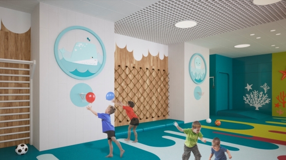 Несмотря на внесенные изменения, проект детского сада оказался ярким и выразительным. В помещениях установлена трансформируемая мебель, которая позволяет увеличить свободное пространство. Кроме того, в детском саду «Ривер Парка» используются современные технологии зонирования, а именно – трансформируемые перегородки, с помощью которых, можно разделить пространство на две независимые друг от друга зоны, к примеру, спальню и игровую. Запроектированы помещения для занятий музыкой, спортом, кабинеты логопеда и психолога, а также комнаты для развивающих занятий. Для развития творческих способностей ребенка и мелкой моторики на стенах предусмотрены яркие и даже частично объемные изображения морских обитателей.