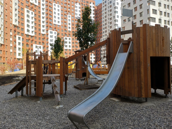 Все детское оборудование, которое представлено в ЖК «Румянцево-Парк», от старейшей немецкой фабрики Richter. Каждая деталь собирается специалистами вручную, а все материалы – полностью экологичные и долговечные. На текущий момент на территории двора ведется монтаж детского оборудования. Игровые детские островки поделены на три зоны, предназначенные на разный возраст детей – от малышей до тинэйджеров. Покрытие на территории двора состоит из разных материалов. Это морская галька, песок, грунт, травяной газон и дерево.