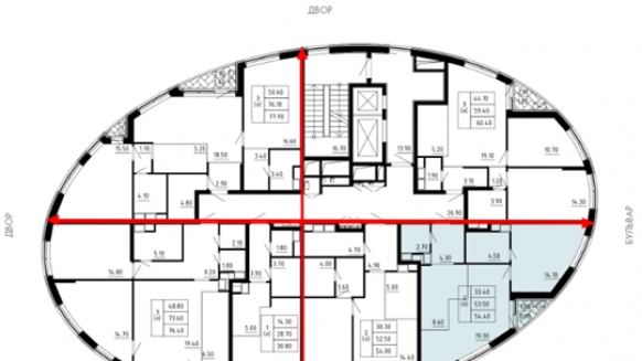 Итогом работы приглашенных экспертов стали два корпуса овальной формы – 2C (Дом Вики Газинской) и 4A (Дом Валерия Гергиева). Каждый этаж имеет соответственно закругленную фасадную стену и прямые внутренние перегородки. Причем крестообразные оси, разделяющие квартиры, не упираются в вершины овала, а смещены вправо. Так у клиента появляется выбор между квартирами с более плавной или более ярко выраженной дугой фасадной стены.