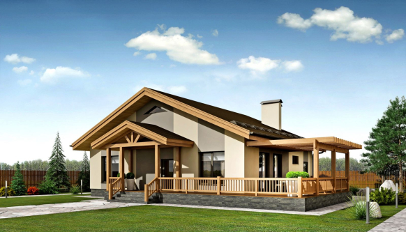 Проект коттеджа, построенный компанией, включает в себя 4 спальни, большую кухню-гостиную, помещение для котельной и раздельный санузел, а также все необходимые инженерные коммуникации, включая вентиляцию и водоснабжение.