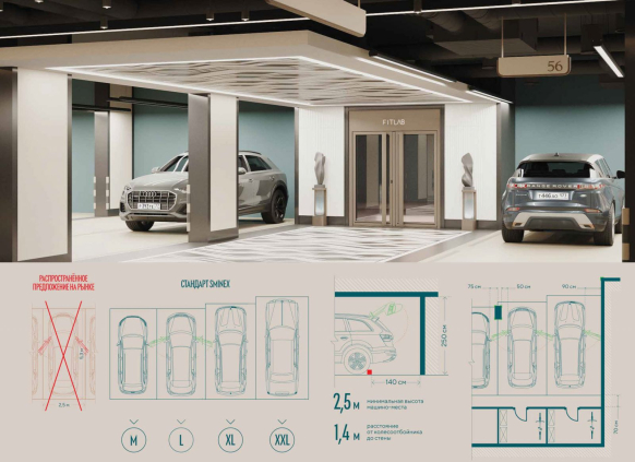При расчете высоты машино-места учитывалась наибольшая амплитуда полного открытия багажника. Согласно разработанному стандарту, минимальная величина до коммуникаций, расположенных под потолком, — 2,4 м. Расстояние от колесоотбойников до стены должно быть не менее 1,4 м. Эксперты учли и габариты наиболее широких — спортивных — автомобилей, поэтому ширина проездов на паркинге должна достигать 6 м.