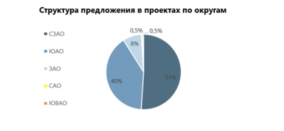 Если посмотреть на географию таких проектов, наибольший объем предложения сконцентрирован в двух округах: СЗАО (51%) и ЮАО (40%) - на них приходится 91% всей экспозиции. Около 8% экспонирующихся лотов локализованы в ЗАО. Доля САО и ЮВАО минимальна – по 0,5% от совокупного объема предложения.