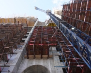 Детский сад с необычным объемно-пространственным решением на крутом рельефе с подпорными стенками спроектирован на внутреннем участке жилой застройки территории жилого комплекса. Проектом предусмотрено строительство удобного проезда для автомобилей.