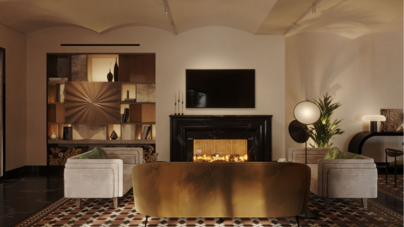 Sminex-Интеко вернёт павильону исторический облик и создаст в нём комфортные условия для знакомства и совместного досуга соседей. Общественная гостиная по стандарту FRIEND’S LAB площадью 60 кв. м разделена на три зоны: с креслами для приватной беседы, со столом для праздников или настольных игр, а также пространство рядом с камином из натурального чёрного мрамора. Для новогодней атмосферы в праздничные дни у камина установлена ель. Рядом с гостиной располагается патио с мягкой мебелью и растениями.