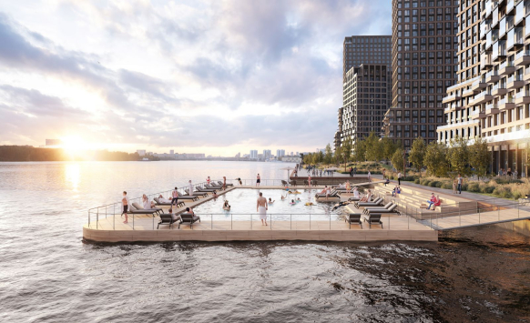 «Архитекторы тщательно подошли к вопросу подготовки мастер-плана и разработали уникальный архитектурный код, создав изящный силуэт из разновысотных зданий вдоль береговой линии. Фасады за счет цветовой гаммы и геометрии развивают идею непрерывного диалога с водой. Связующим элементом между парковой зоной и застройкой станет стилобат с общественной видовой террасой с озеленением», - отметил Сергей Кузнецов.